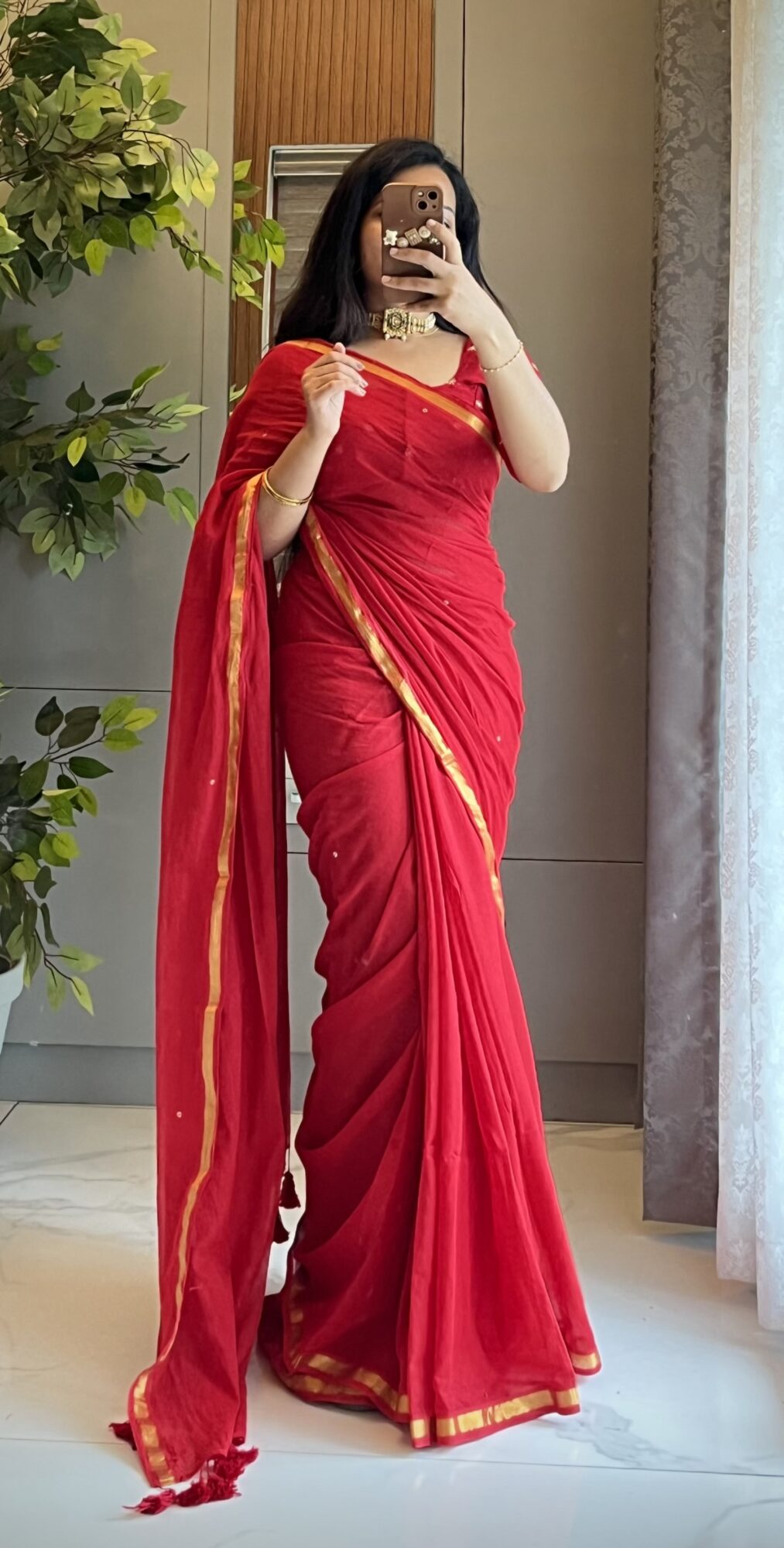 Color: Bright red with golden zari border and subtle golden sequin detailing