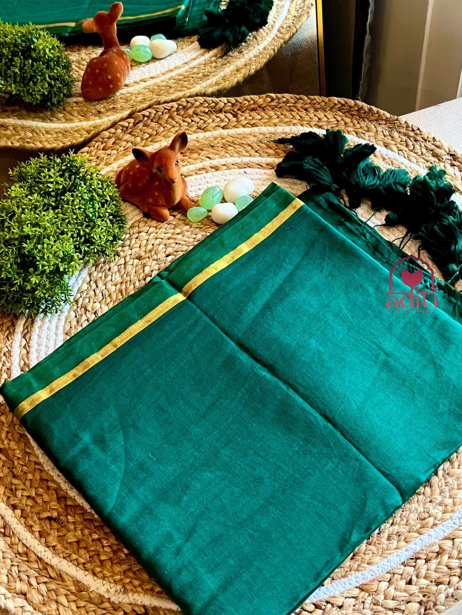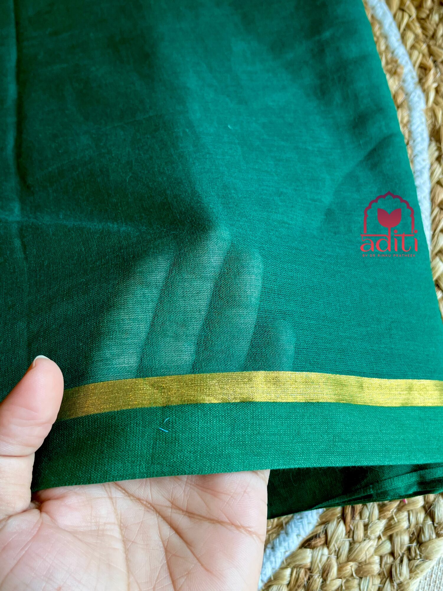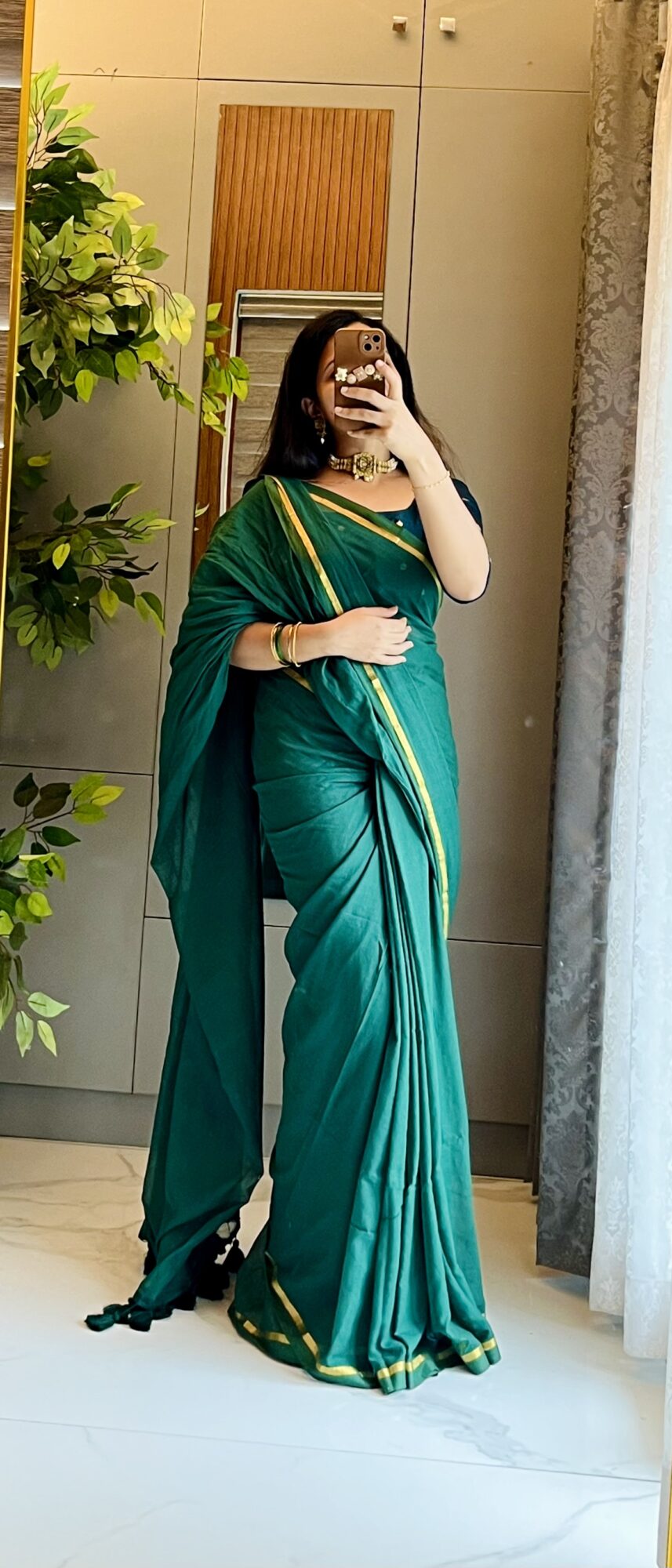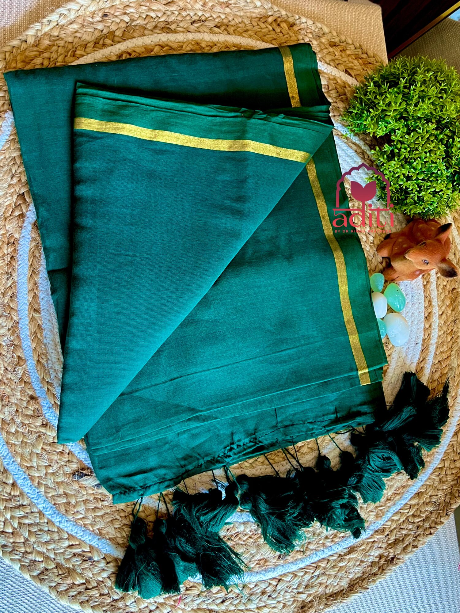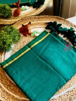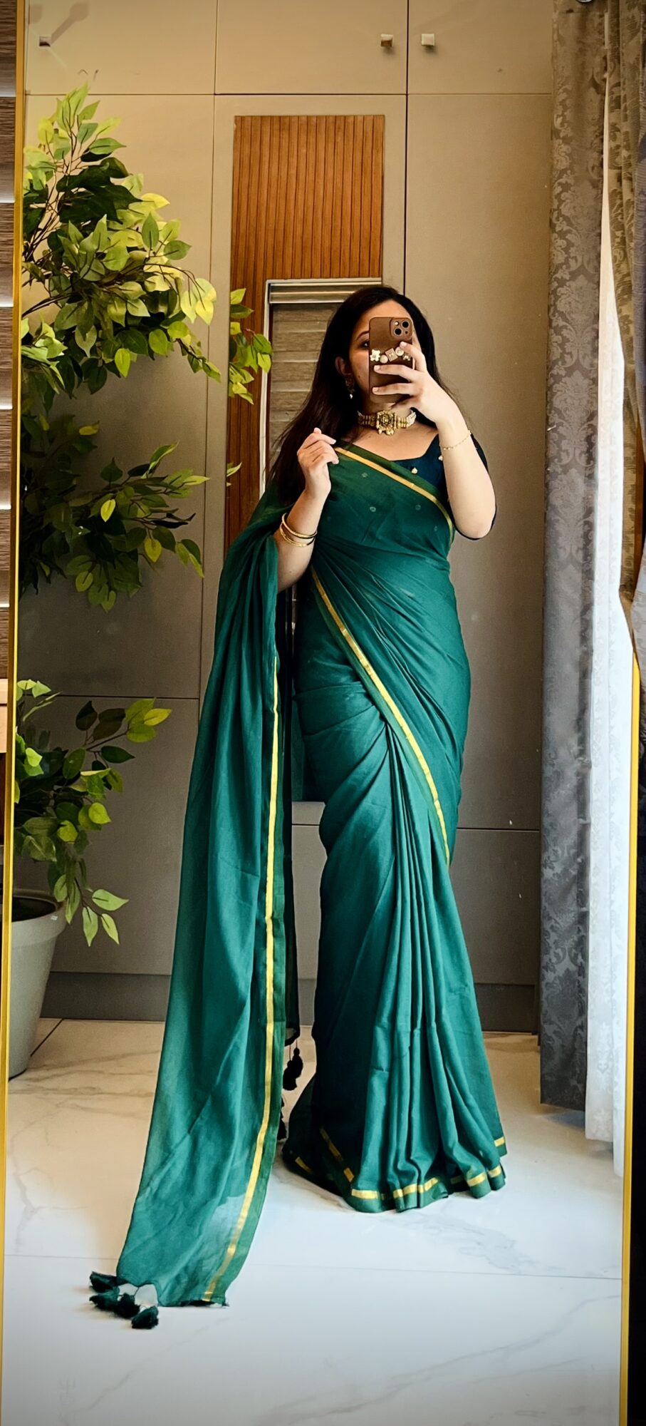 Like a vine that sways gently in the breeze, Charulata embodies effortless grace. This pure 120 count mulcotton saree is woven in a lush green hue inspired by the calmness of the earth after rain. Its soft texture and light drape make it a perfect companion for serene days and festive evenings alike. The subtle golden zari border adds just the right hint of elegance, creating a look that’s both natural and timeless.