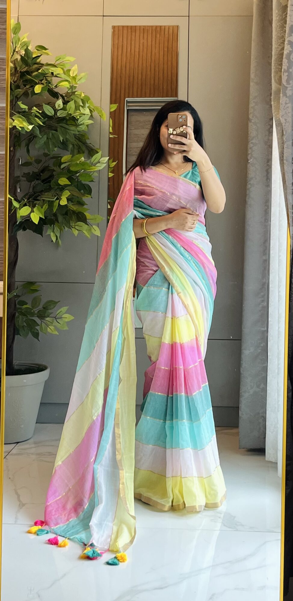 - Design: Pastel stripes with golden zari highlights and multicolor tassel detailing