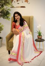 Mallika – White MUL Cotton Saree with Red & Golden Stripes