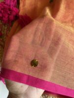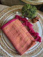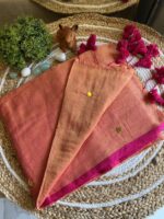 Wrap yourself in effortless elegance with this Pure 120 Count Mul Cotton Saree, featuring a soothing peach body beautifully contrasted by rani pink borders and tassels. The saree is adorned with delicate hand-stitched gini detailing, adding a subtle handcrafted charm. Lightweight and breathable, this drape is perfect for everyday comfort or graceful festive wear.