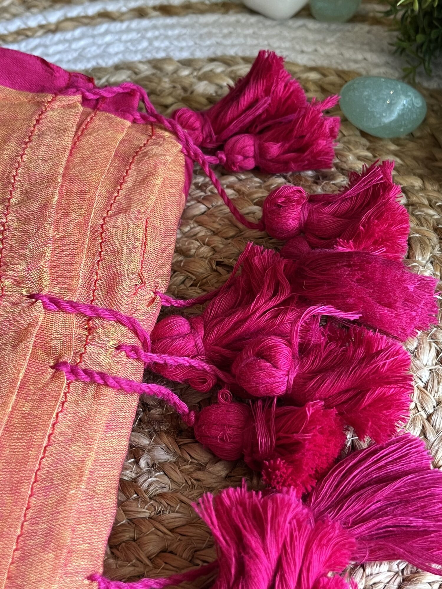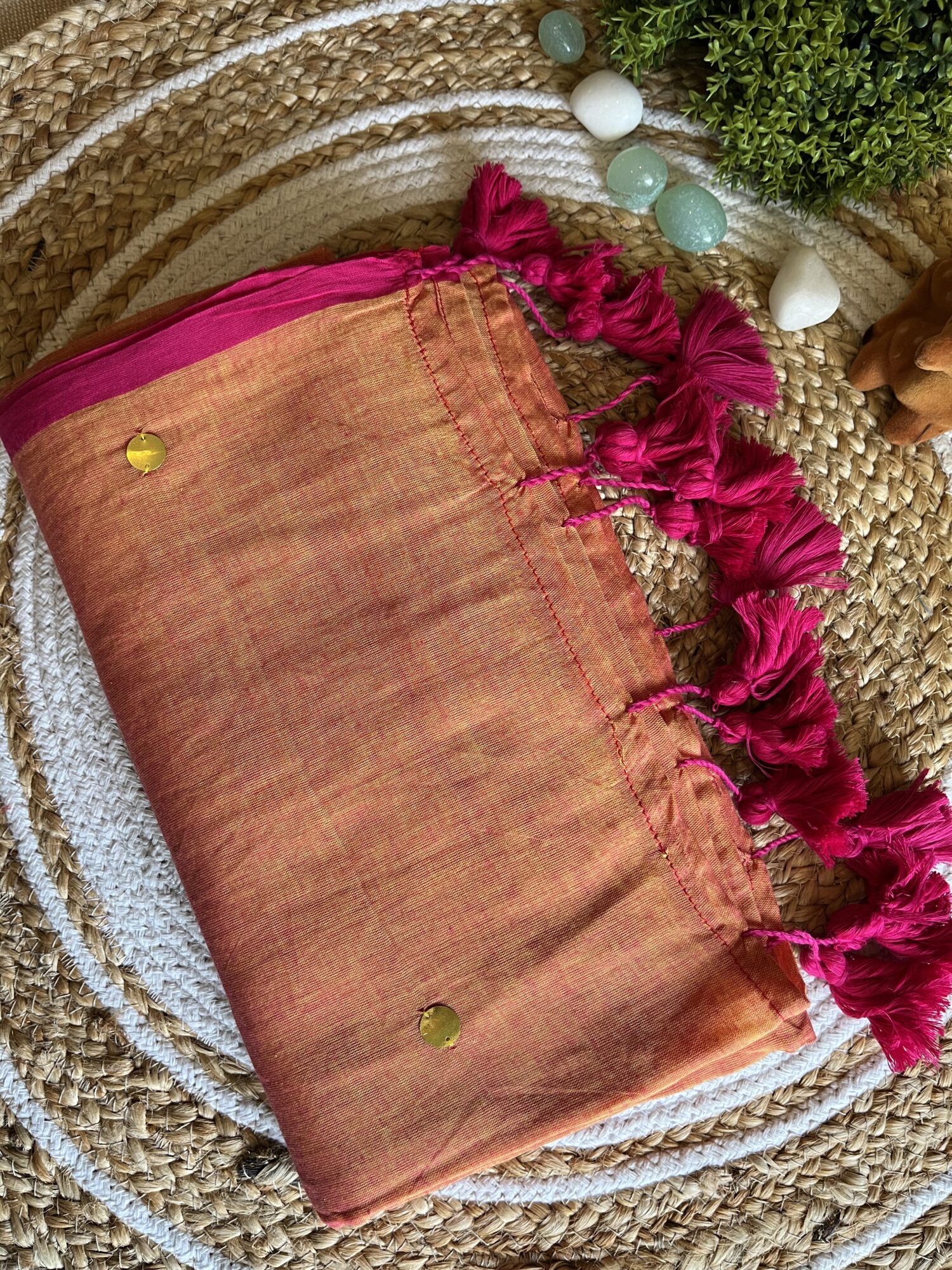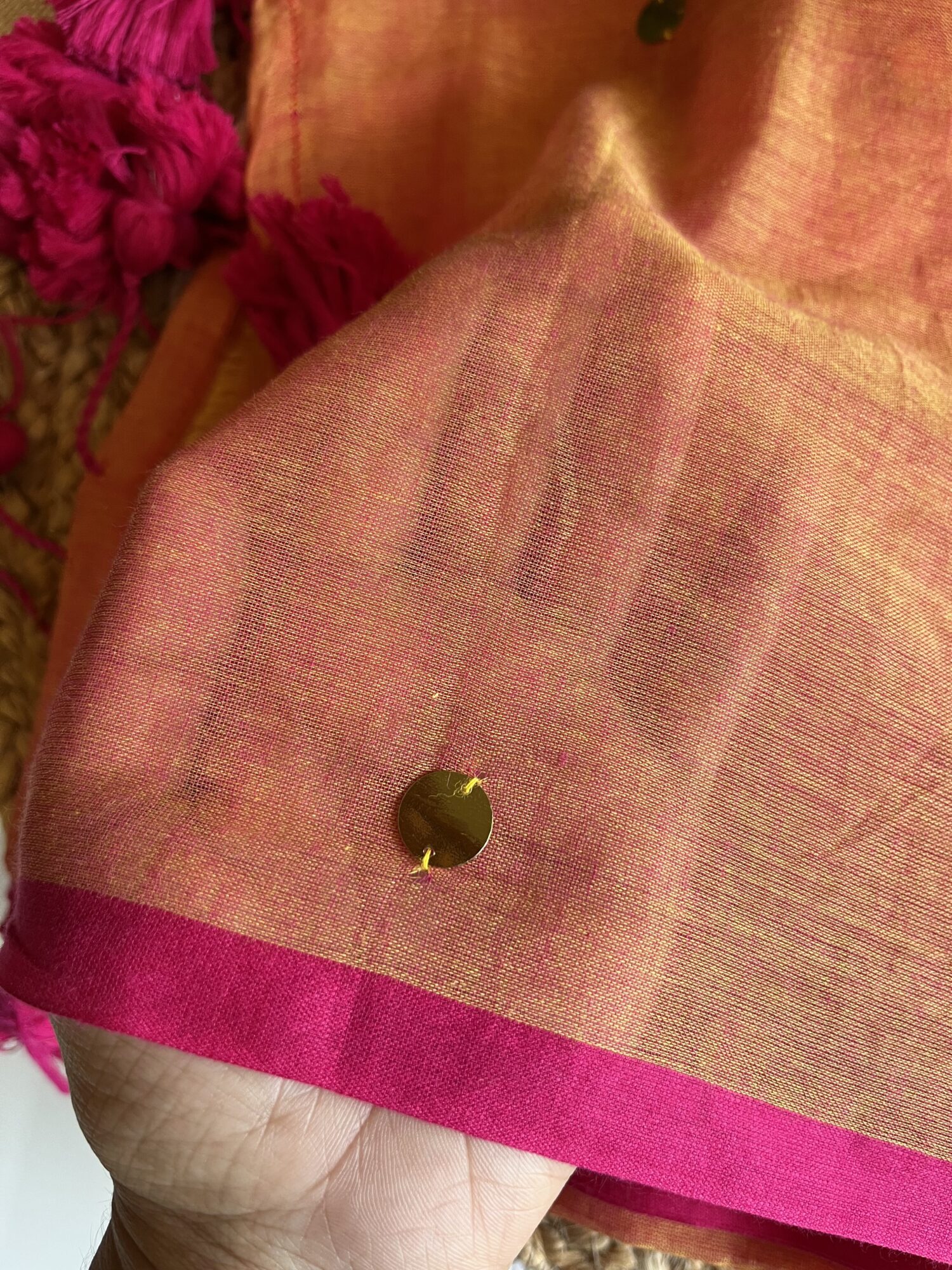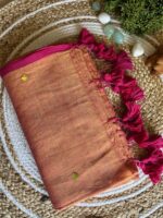 - Colour: Peach body with rani pink borders and tassels