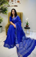 Turn heads in timeless elegance with our Royal Sapphire Silk Cotton Saree — a captivating blend of traditional charm and modern finesse. Woven in deep royal blue, this saree features fine silver zari lines throughout the body, adding a gentle shimmer and refined texture.