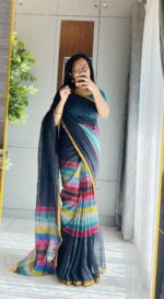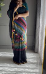 Add a touch of vibrant grace to your wardrobe with Sitara, a pure 120 count mul cotton saree that celebrates color and comfort in every drape. The saree features bold multicolored stripes running across the body, beautifully complemented by a checked pallu adorned with playful tassels. Lightweight, breathable, and soft on the skin, Sitara brings effortless charm to both casual days and festive moments.