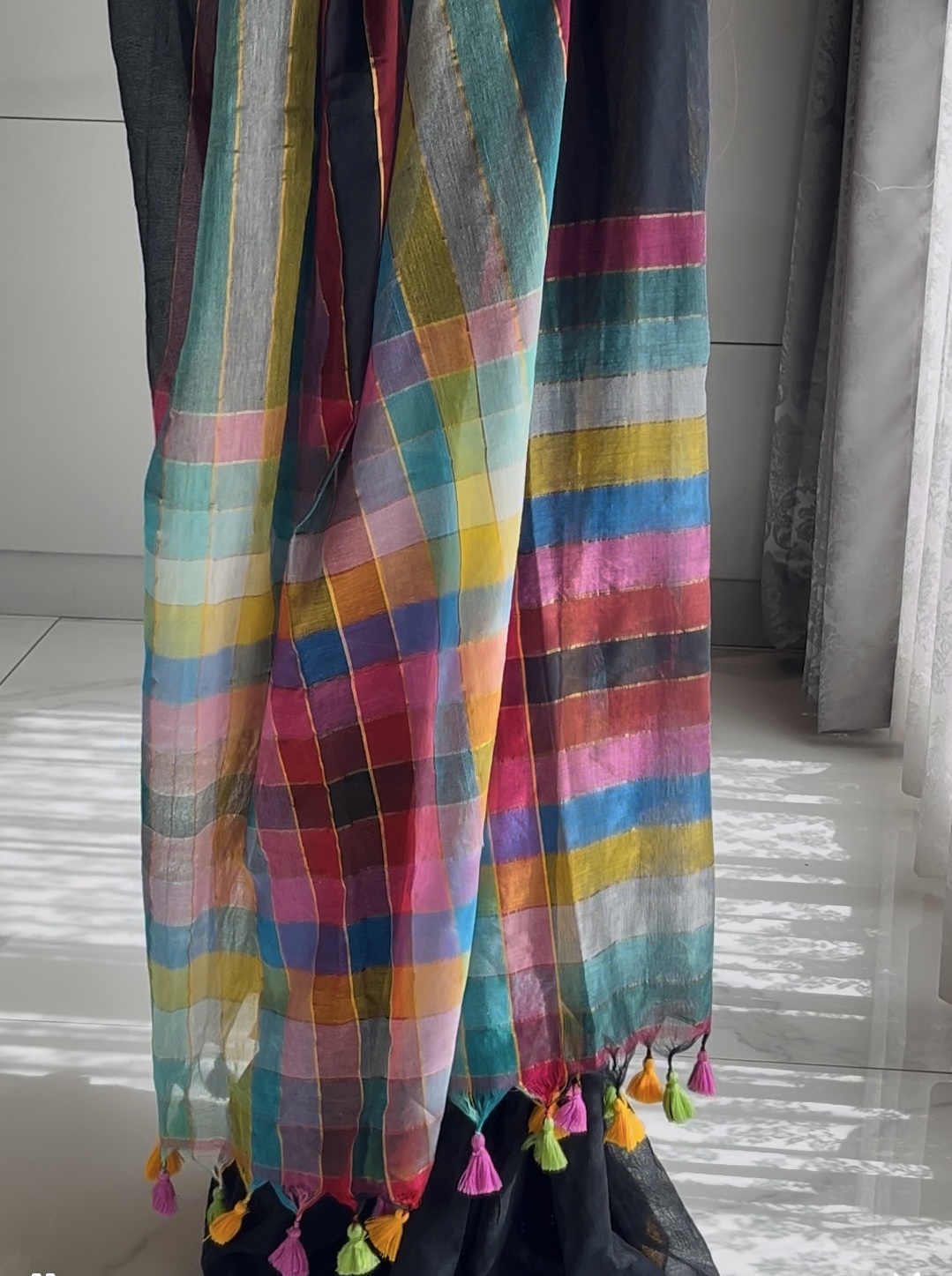 - Pattern: Multicolored stripes with checked pallu and tassel detailing