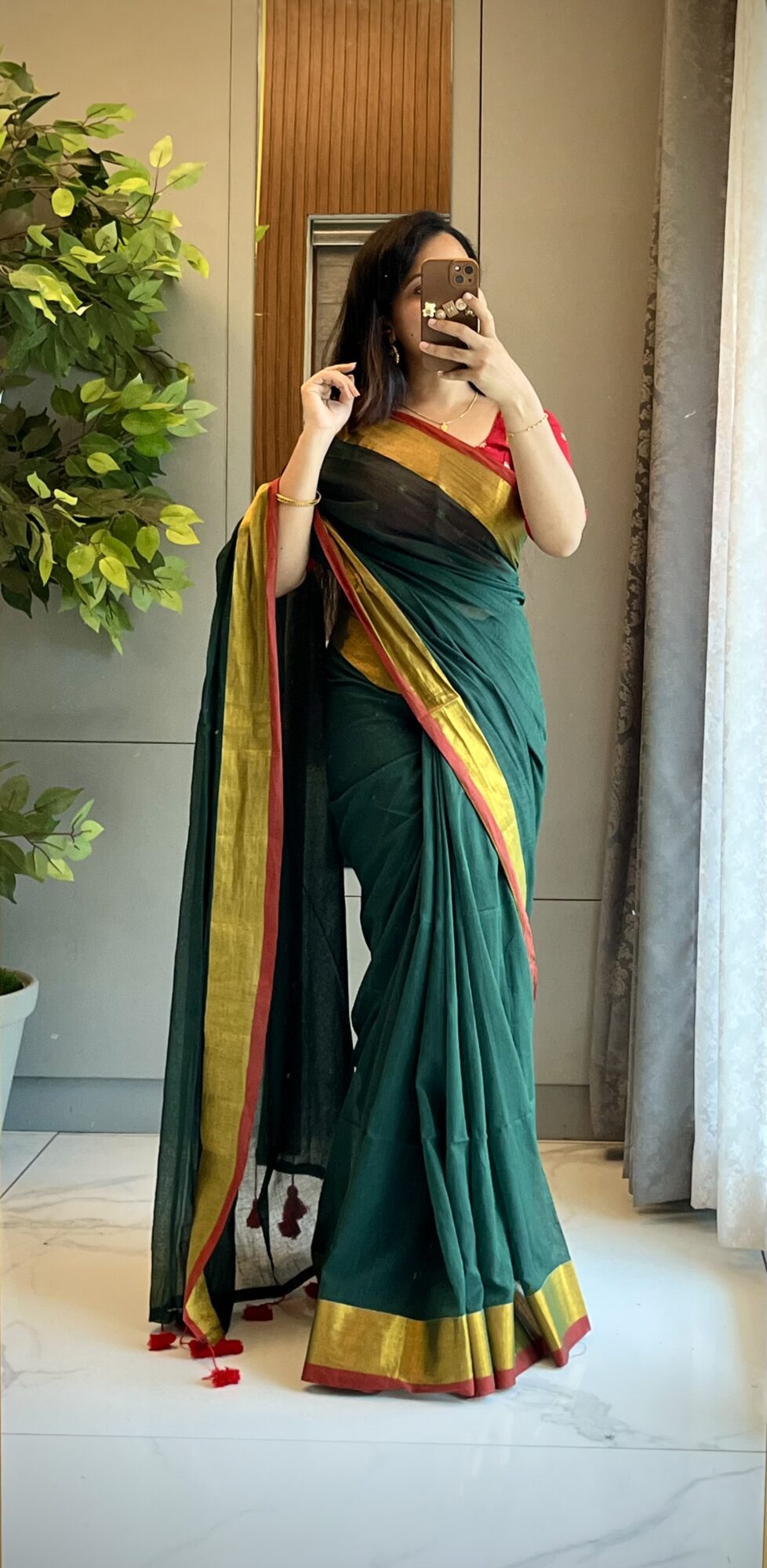 Graceful and timeless, Vrinda is a Pure 120 Count Mulcotton saree in a rich green shade, beautifully highlighted with golden and maroon borders. The soft, breathable mulcotton fabric drapes elegantly, offering a perfect blend of comfort and tradition. Ideal for festive occasions or casual wear, Vrinda adds an earthy yet regal charm to your collection.