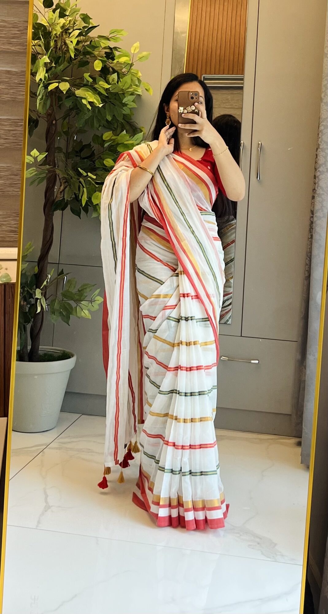Bring home a classic touch of elegance with this Pure 120 Count Mulcotton Saree. Woven in a soft white base, the saree is adorned with vibrant stripes in red, green, and golden, lending it a cheerful yet graceful appeal. The bold red selvedge and striped pallu add striking detail, making it a versatile pick for festive occasions, casual gatherings, or everyday sophistication.